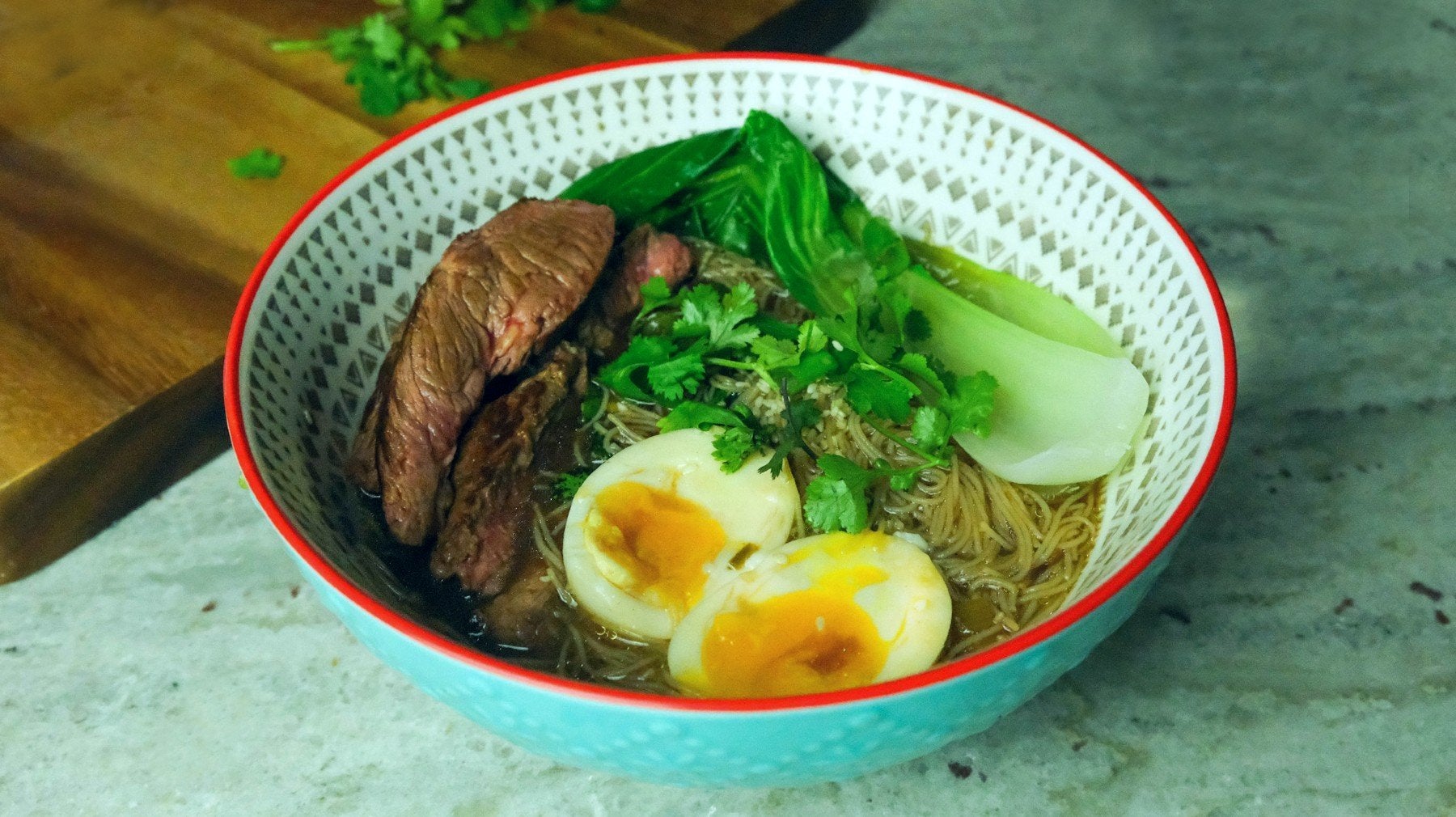 11. Serve your noodles and broth with the steak and an egg. Garnish with spring onion and coriander, and enjoy!