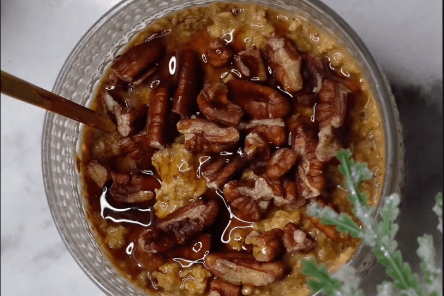 Top with vanilla, maple syrup, and any other toppings you’d like! @fitbymandi uses pecans and a pinch of salt. Enjoy!