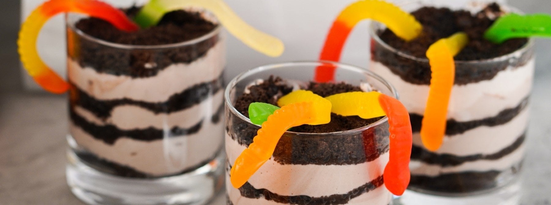 Now, it’s time to assemble. Alternate layers of crumbled cookies and yogurt mix in a tumbler-style glass. Make sure that the last layer is made of the crumbled cookies, as this will be the “mud” for the worms.
