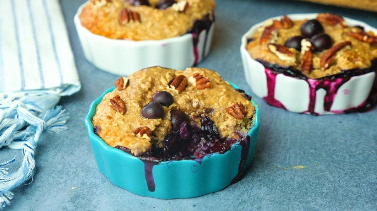 - Add your blueberry sauce to 4 small oven-proof ramekins or baking dishes, then top with the oat mixture. Decorate with blueberries and pecans, then bake for 12 minutes. Dig in!