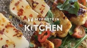 Next, heat a little low-calorie cooking spray in a non-stick pan and add your halloumi slices. Drizzle with the chilli-honey mixture and cook for a few minutes on each side until golden brown.