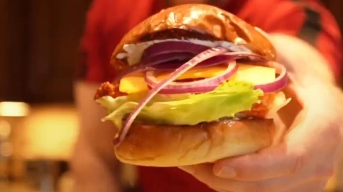 Add your lettuce, tomato, chicken, slice of cheese, and red onions to your sandwich.
