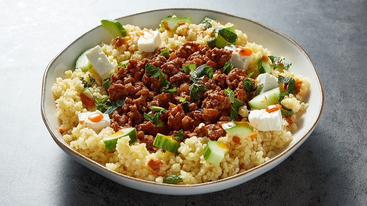 Mix up your meal prep with a Mediterranean classic — this spiced lamb is full of smoky, rich flavour and the bulgur wheat side is a boosted with fresh, crunchy cucumber and tangy feta.
