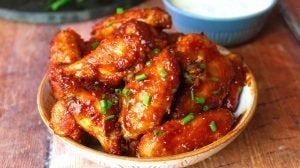 - Meanwhile, mix together the honey BBQ sauce ingredients until fully combined. Once wings are baked, remove from oven and drizzle with honey BBQ sauce. Using tongs, flip your wings to coat in sauce and then once completely coated, bake for a final 5 minutes and then remove.